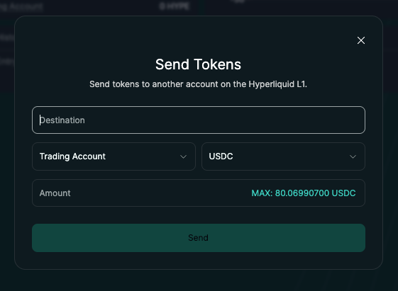 - Fund the wallet by sending USDC from your Hyperliquid account to the agent's wallet address using the Send feature on app.hyperliquid.xyz. Note: funding should be done on Hyperliquid L1 only.